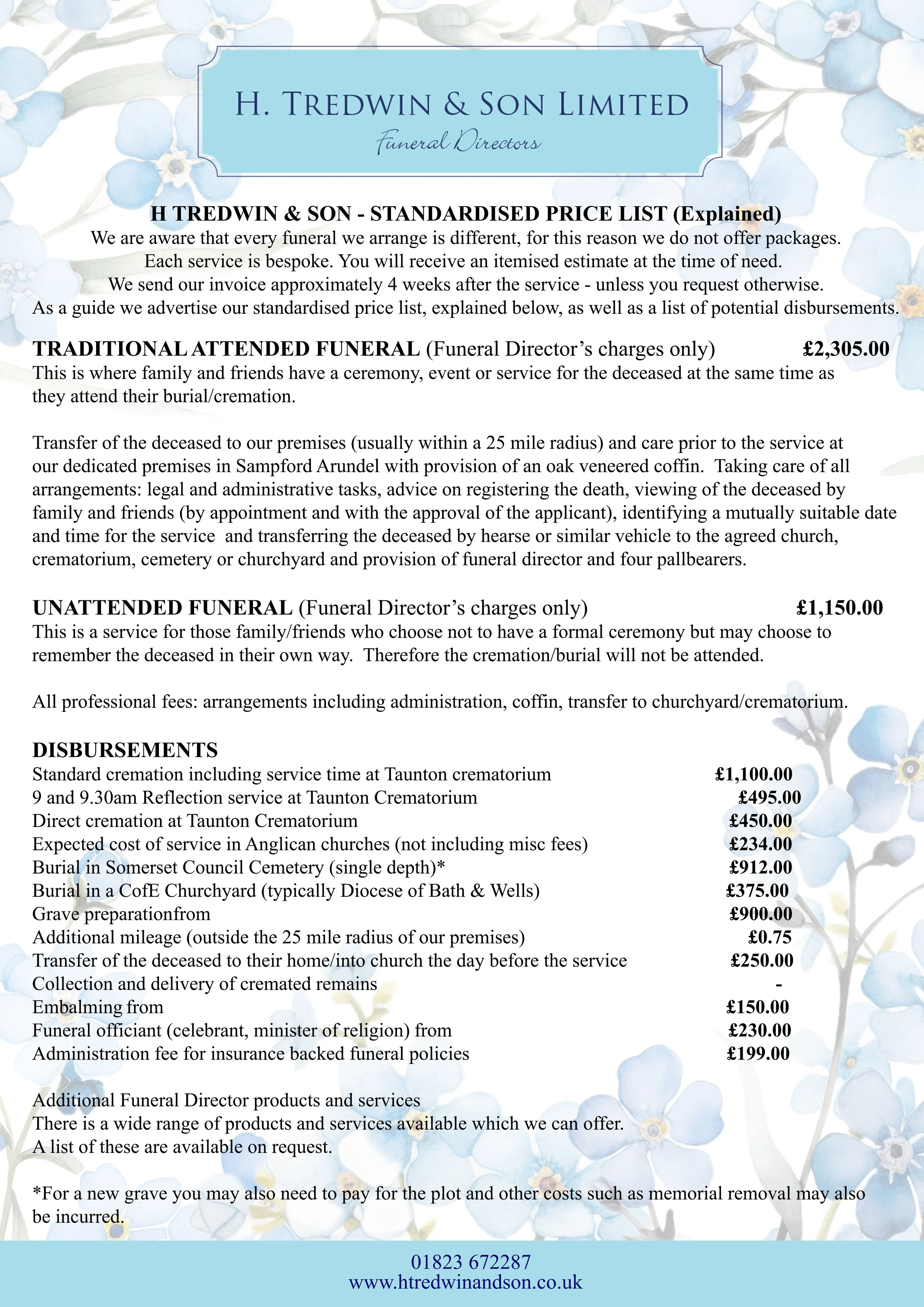 All funeral directors are legally required to publish this Price List for a standardised set of products and services. This helps you understand your options, make informed choices, and compare prices between different funeral directors, as costs can vary.